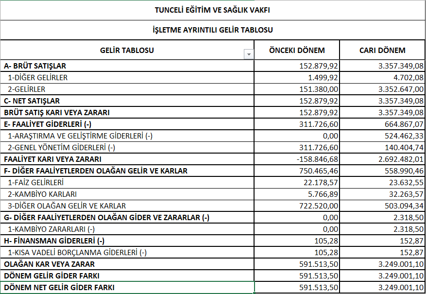 Gelir Tablosu 2020